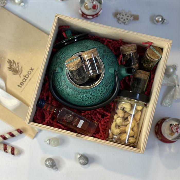 Συσκευασία δώρου με προϊόντα, σε ξύλινη συσκευασία.